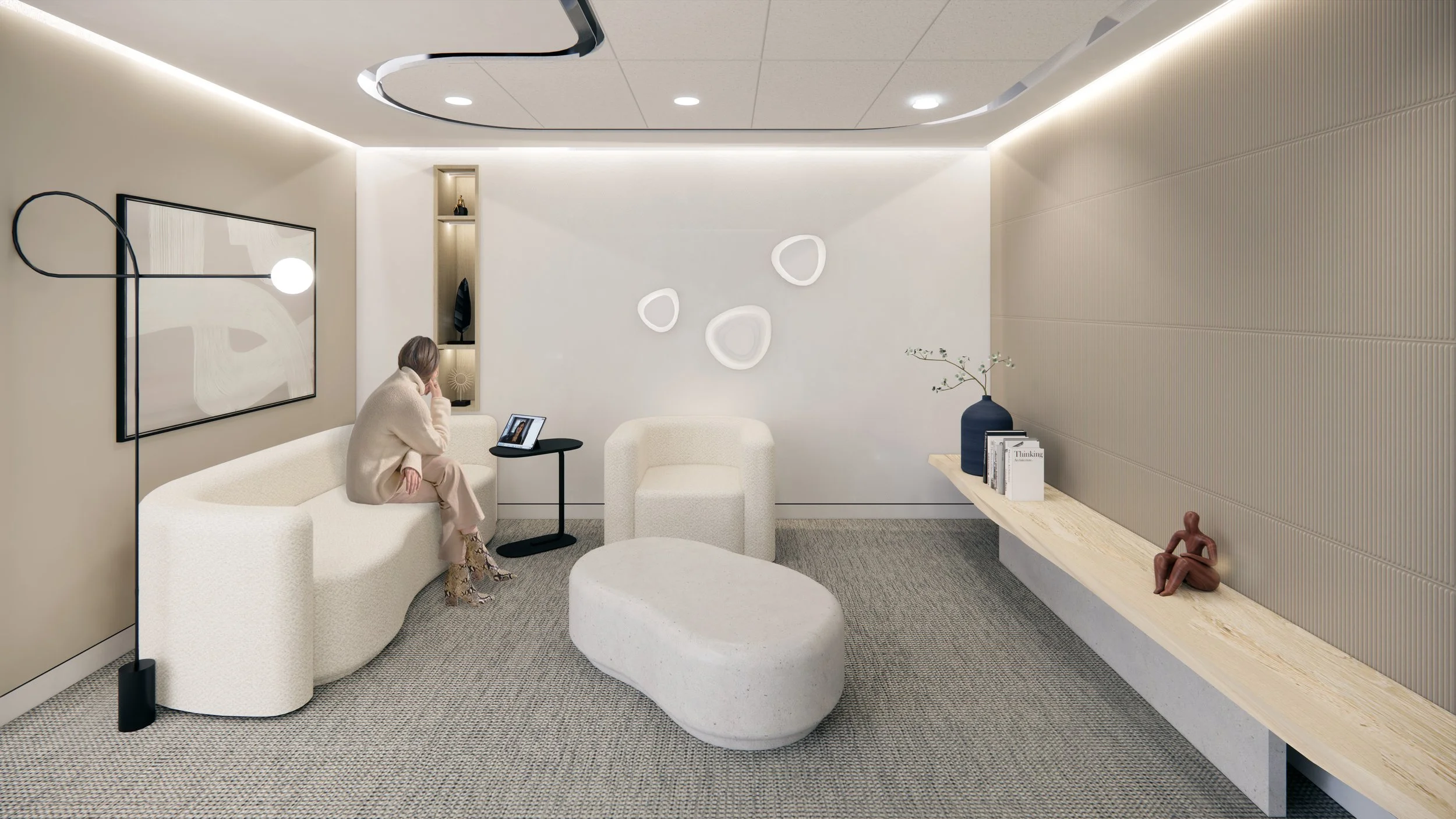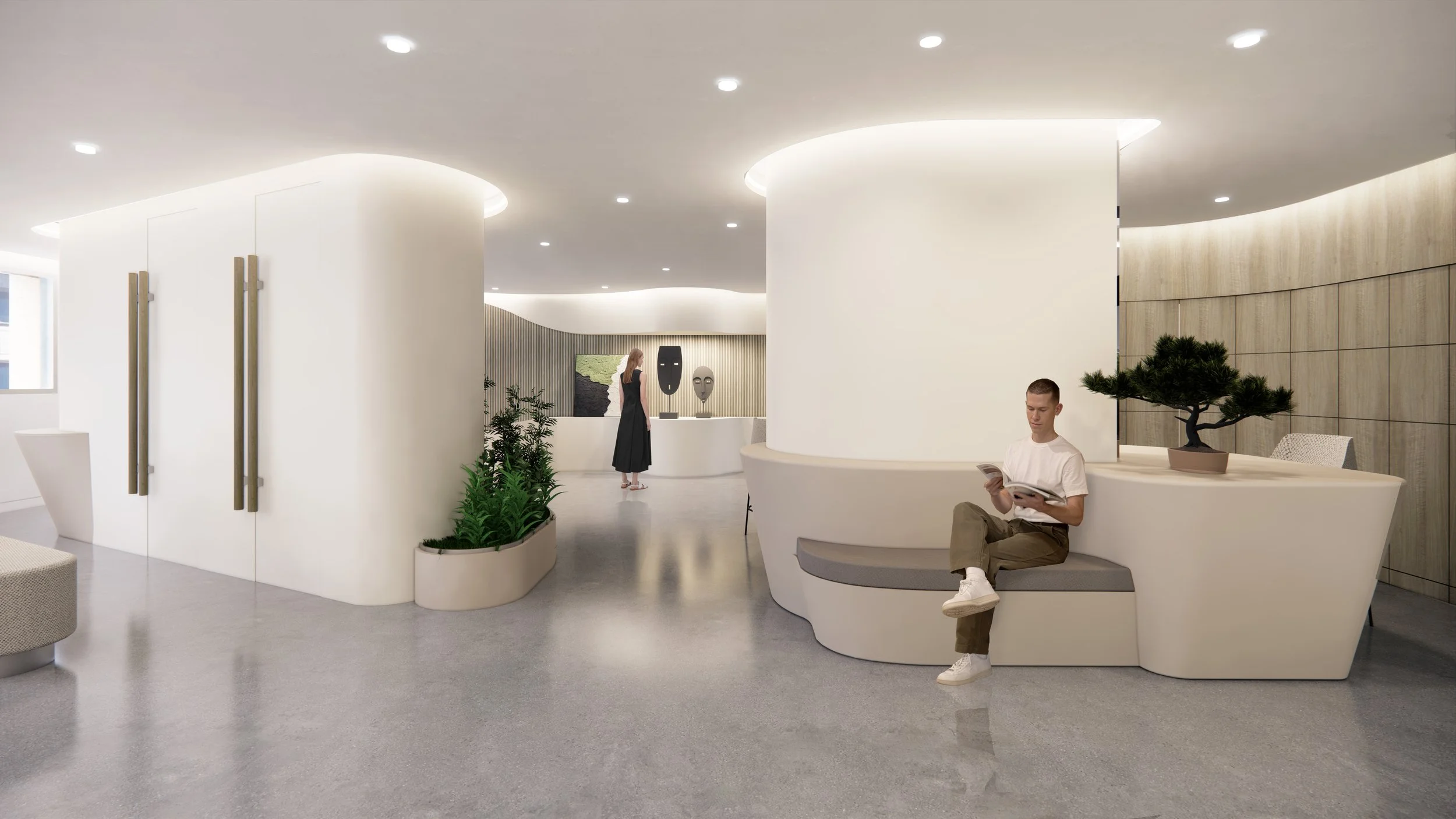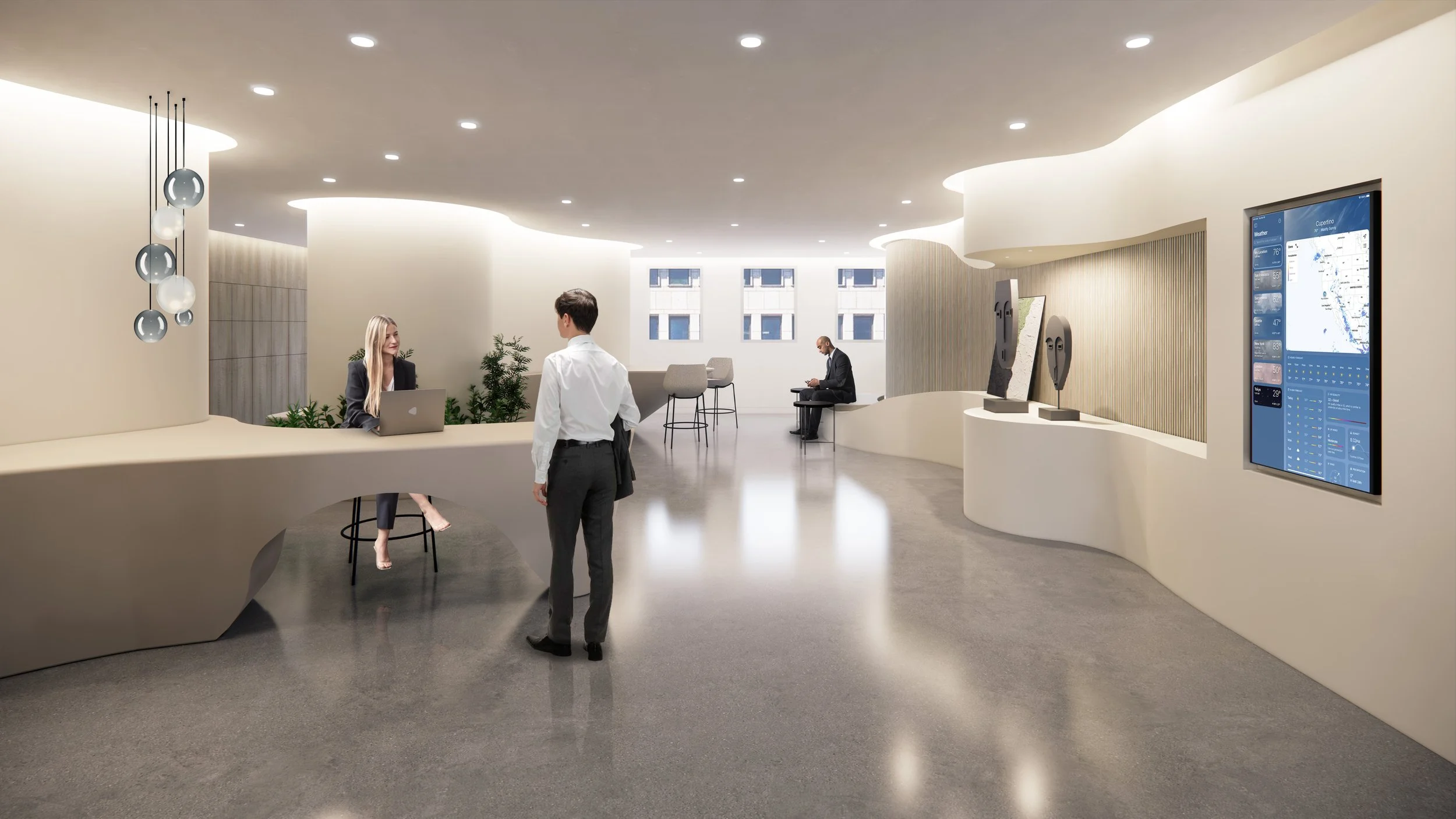 The complexity of the architectural curvature, particularly evident in the lobby area, presented a compelling challenge both in terms of documentation and construction administration.